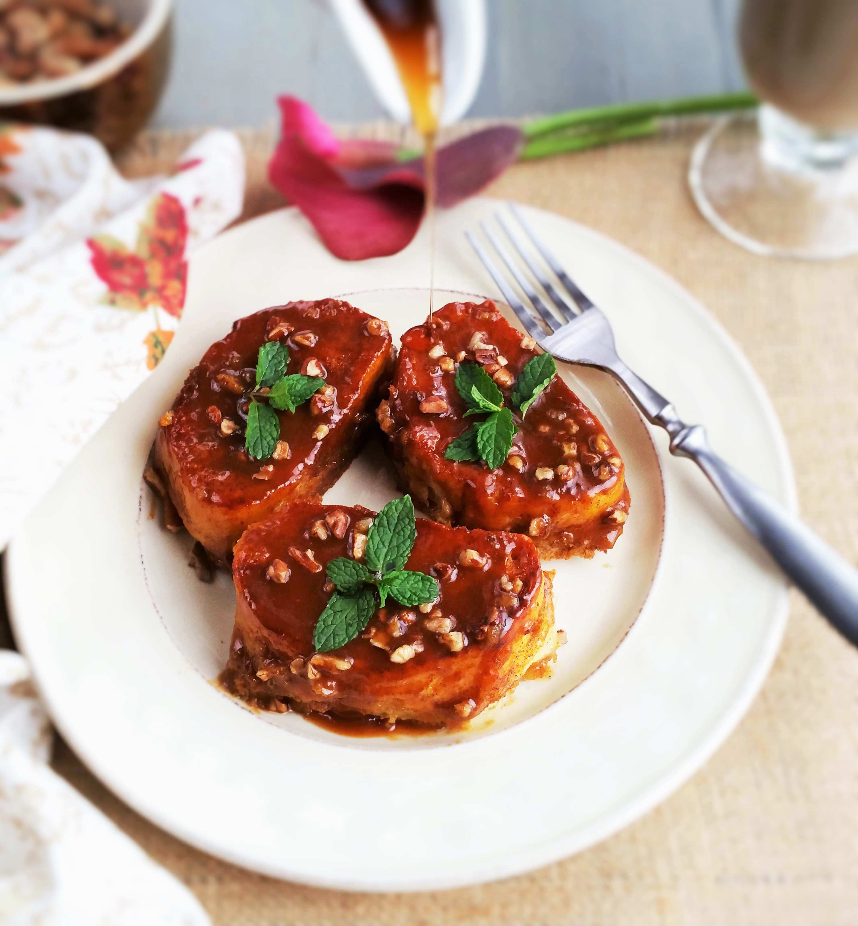 I absolutely adore overnight brunch recipes! They are perfect for entertaining when you have other food to prepare the same morning. You just pop it in the oven in the morning and prepare the homemade butterscotch syrup that pairs so wonderfully with the pumpkin. If you are short on time, you can easily just top it with maple syrup as well.